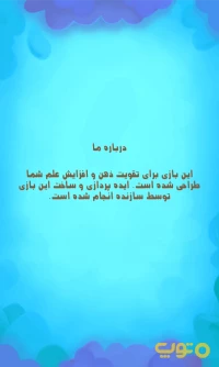 من توسعه دهند این بازی سجاد درویش زاده دانش آموز پایه ششم دبستان بصیرت (اهواز) به کودکان و نوجوانان هم سن و سال خودم توصیه می کنم هر روز قرآن بخوانند حتی اگر سوره هایی کوتاه و به جستجو پاسخ سوالات این بازی بپردازند.