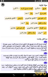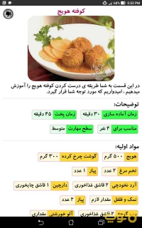 اپلیکیشن «طرز تهیه انواع کوفته» برنامه ای جامع و کامل برای آموزش و پخت انواع کوفته ها می باشد. در این برنامه لیست کاملی از انواع کوفته ها گنجانده شده است که با انتخاب هر دستور می توانید مواد لازم،یک تصویر کلی از کوفته آماده شده، زمان آماده سازی، زمان انتظار برای پخت، حجم غذای تولیدی به تعداد نفر، درجه سختی، نحوه آماده سازی مواد اولیه و هم چنین مراحل آماده سازی و پخت را مشاهده نمایید.
