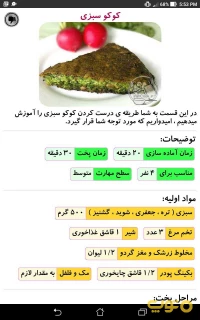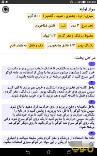 اپلیکیشن «آموزش پخت انواع کوکو» برنامه ای جامع و کامل برای آموزش و پخت انواع کوکوهامی باشد. در این برنامه لیست کاملی از انواع کوکوها گنجانده شده است که با انتخاب هر دستور می توانید مواد لازم،یک تصویر کلی از کوکوی آماده شده، زمان آماده سازی، زمان انتظار برای پخت، حجم غذای تولیدی به تعداد نفر، درجه سختی، نحوه آماده سازی مواد اولیه و هم چنین مراحل آماده سازی و پخت را مشاهده نمایید.