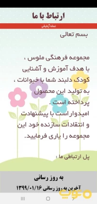 اپلیکیشن ملوس جهت آشنایی کودکان با دیگر مخلوقات پروردگار تولید شده است و در این برنامه اسم و صدای حیوانات به کودکان دلبند آموزش داده می شود.