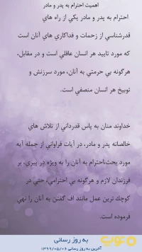 در این برنامه با ارایه احادیث و روایاتی چند در رابطه با احترام به پدر و مادر، سعی بر بیان اهمیت بالای این موضوع داریم.