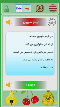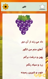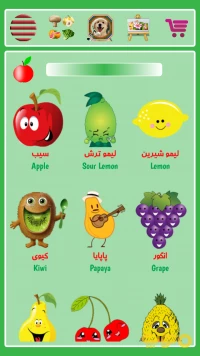 در این مجموعه تعداد زیادی میوه با تصاویر کارتونی همراه با اسم فارسی و انگلیسی قرار داده شده که با ورود به هرکدام یک شعر کودکانه از توصیف ویژگیهای میوه پخش میشود.