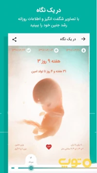 اطلاعات روزانه متناسب با روز بارداری شما ، پیام هایی شامل ویدیوی رشد جنین، تغذیه و توصیه های پزشکی، باید ها و نبایدها، دستورغذای بارداری و ...