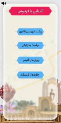 این نرم افزار شامل بخش معرفی رشته های مختلف شغلی شهرستان ، امکانات و لوازم مورد نیاز و ظرفیتهای شهرستان در آن رشته شغلی و در بخش دیگر معرفیشهرستان فردوس است.اطلس (به انگلیسی: Atlas) مجموعهای از نقشه و معمولاً نقشههایی از کره زمین است. اطلسهایی از سیارههای دیگر در سامانه خورشیدی نیز وجود دارند. اطلسها به طور سنتی به صورت کتاب بودند. ولی امروزه اطلسهای فراوانی به شکل چندرسانهای در دسترس هستند. همچنین در بعضی از اطلسها میتوان فهرست همه کشورها و اطلاعات مربوط به آن را مانند جمعیت، پرچم، و واحد پول را یافت.