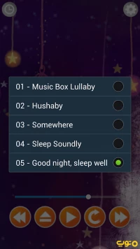 یکی از ۵ صوت لالایی این نرمافزار را اجرا کنید و زمانسنج را تنظیم کنید تا کودک از صوت زیبا و دلنشین آن لذت ببرد.