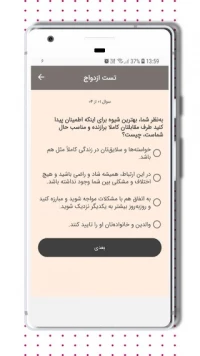 ازدواج یکی از مهم ترین تصمیمات و اتفاقات زندگی هر فرد است. پیش از آنکه وارد این مرحله شوید، میبایست اطلاعات جامع و کاملی داشته باشید. ما در این اپلیکیشن، به روش ساده اطلاعاتی که نیاز دارید را در اختیارتان قرار داده ایم. در این اپلیکیشن میتوانید چندین تست آمادگی ازدواج را به صورت همزامان انجام داده و نتیجه آنها را مطالعه نمایید. از شریک زندگیتان بخواهید همراه با شما تستهای آمادگی ازدواج را انجام دهد و با اطلاعات کامل به سوی موفقیت در زندگی زناشویی پیش بروید.