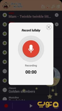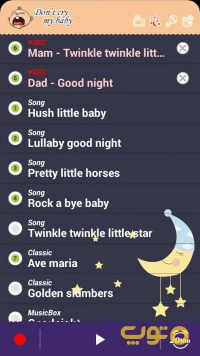 ۲- برنامه دارای ۱۲ لالایی انگلیسی مشهور است. همچنین قابلیت ضبط صدای مادر و پدر نوزاد و پخش آن وجود دارد.