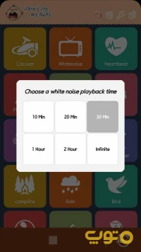 ۱- برنامه دارای صدای برفکی (نویز سفید) است. نوزادان زیر ۳ ماه با شنیدن صدای قلب مادر، چکه آب، شستن لباس و امثال آن براحتی میخوابند.