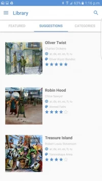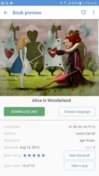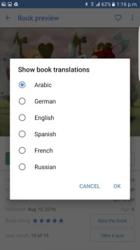 My wonder book -3 کتاب شگفت انگیز من یک مجموعه داستان های باورنکردنی باستانی،افسانه و داستان هایی با تصاویرو داستان سرایی است.در زمان بازبینی،50 داستان از سیندرلا تا شیر و موش تا الیورتوئیست وجود داشت.تمام داستان ها به 6 زبان انگلیسی،عربی،فرانسوی،روسی،آلمانی و اسپانیایی در دسترس است.زبان پیش فرض برای همه ی داستان ها به نظر میرسد عربی است.برای انتخاب یک زبان دیگر شما به سادگی روی choose language "انتخاب زبان" کلیک کنید و روی زبان دلخواه کلیک کنید.برای اولین بار که زبان تود را انتخاب کردید،باید آنرا دانلود کنید.در هر مرحله از هر داستان بچه ها میتوانند روی دکمه ی share اشتراک گذاری کلیک کنند تا به طور مستقیم به امکانات اشتراک گذاری دستگاه دسترسی پیدا کنند و صفحه ای از داستان را ارسال کنند.در زمان بازبینی فقط امکان read to meبرایم بخوان کار کرد و عملکرد ترجمه ی فوری در دسترس نبود.