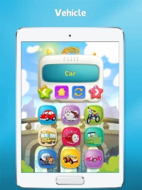 ماشین بازی: مناسب برای تقویت حافظه و قوه تشخیص کودک بوده و تعداد زیادی وسیله نقلیه با شکلهای کارتونی بامزه به همراه نام و صدای وسیلهها در این بازی قرار دارد. شامل ماشین آتش نشانی، کشتی، موتور، بولدوزر، ماشین مسابقه، اتوبوس، دوچرخه، قایق، ماشین پلیس، تاکسی و ...